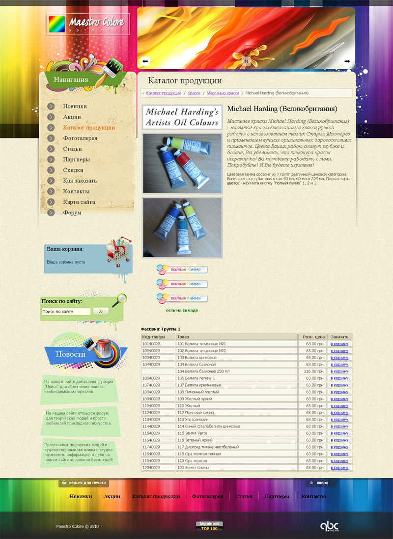 Адрес сайта: http://www.maestro-colore.com.ua Задача: создать каталог расходных материалов для изобразительного искусства с системой формирования заказа, анонсами новых поступлений и отдельными прайс-листами для оптовых клиентов. Решение: Креативный дизайн. Однотипное и простое структурирование каталогов продукции. Язык сайта: русский. Поддержка сайта: полностью администрируемый заказчиком сайт.
