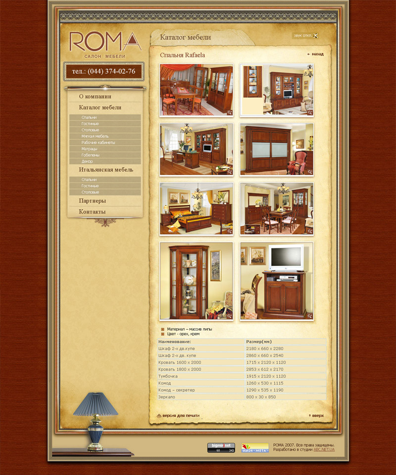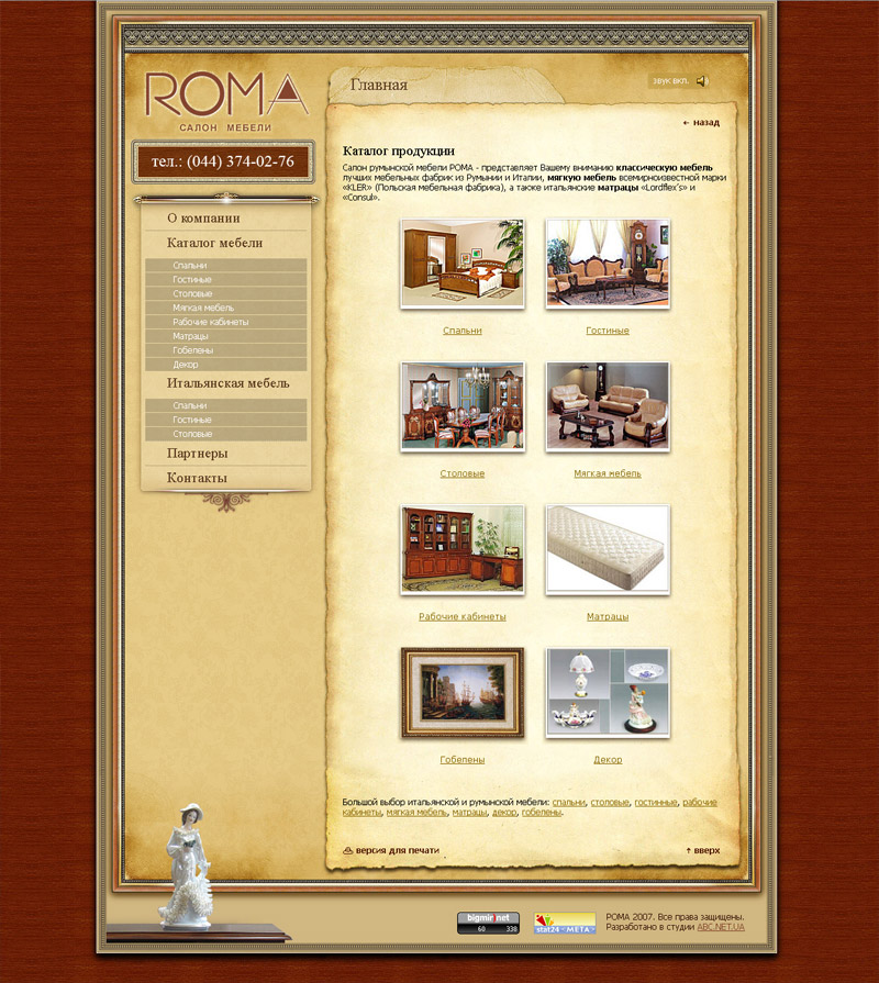 Адреса сайта: http://www.mebliro.com.ua Завдання: створити сайт дистриб'ютора ексклюзивних румунських меблів. Рішення: Вишуканий художній дизайн в теплих тонах, зручна навігація, легка фонова музика. Постобробка кожної фотографії в каталозі. Мова сайту: руська. Підтримка сайту: сайт на обслуговуванні у студії.